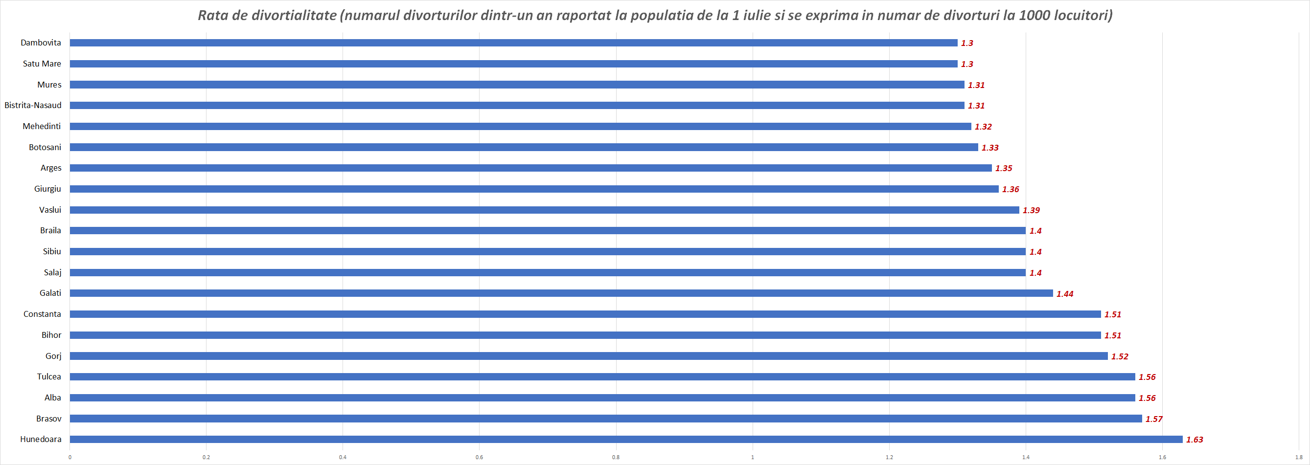 - Cea mai mare rată a divorţialităţii s-a înregistrat în judeţul Braşov (1,37 divorţuri la 1000 locuitori) şi cea mai mică rată de divorţialitate s-a înregistrat în judeţul Vâlcea (0,37 divorţuri la 1000 locuitori).