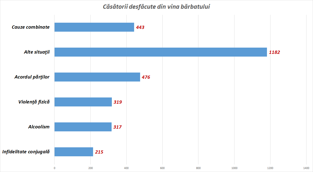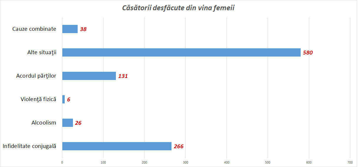 - Divorţurile s-au pronunţat în 47,0% dintre cazuri din vina ambilor soţi, în 10,2% din cazuri din vina soţului, în 3,5% dintre cazuri din vina soţiei