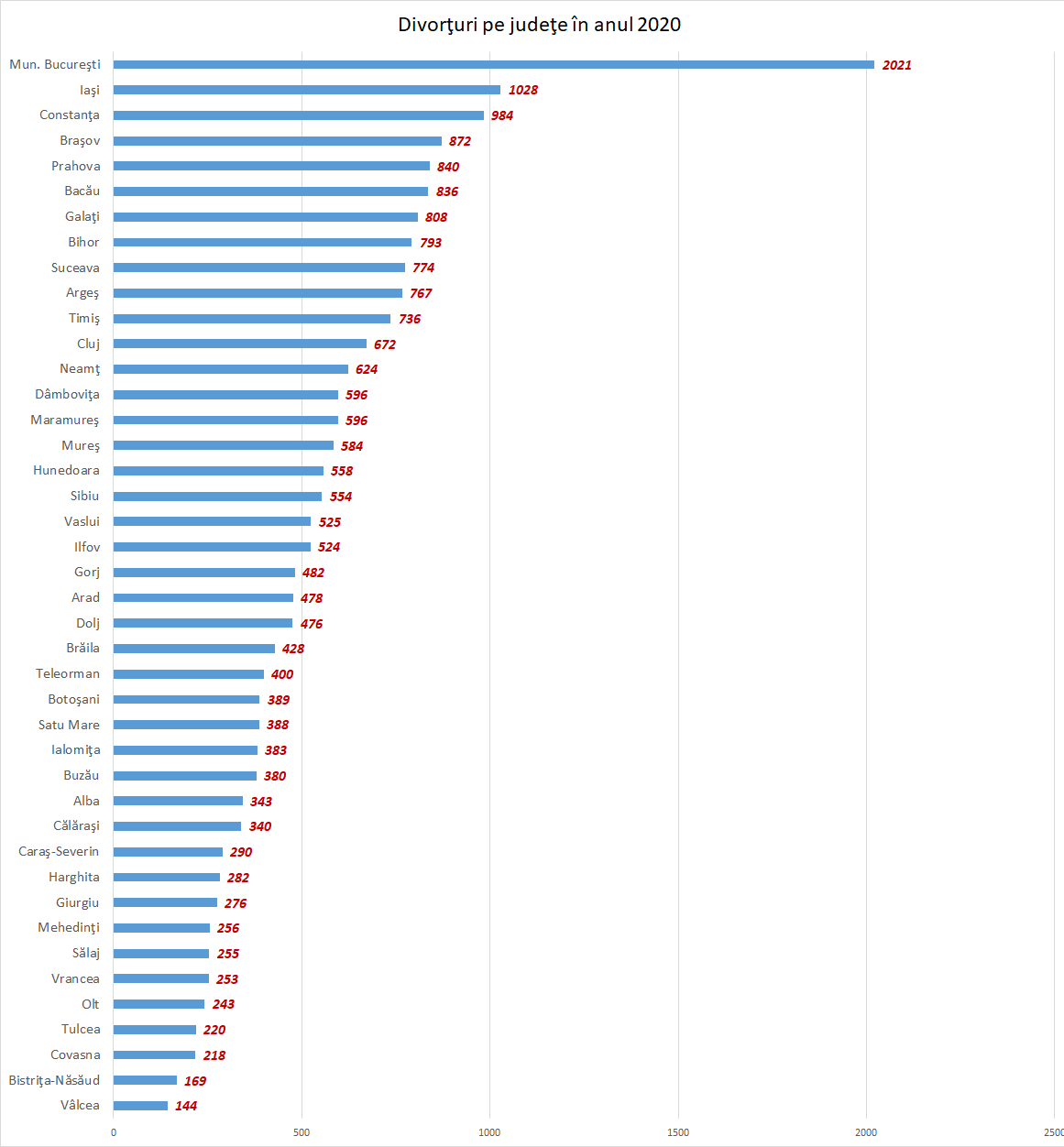 - Cele mai multe divorţuri s-au înregistrat în Municipiul Bucureşti (aproape 10% din cazurile de divorț). Judeţul Iaşi este singurul judeţ unde s-au înregistrat peste 1000 cazuri de divorţ.