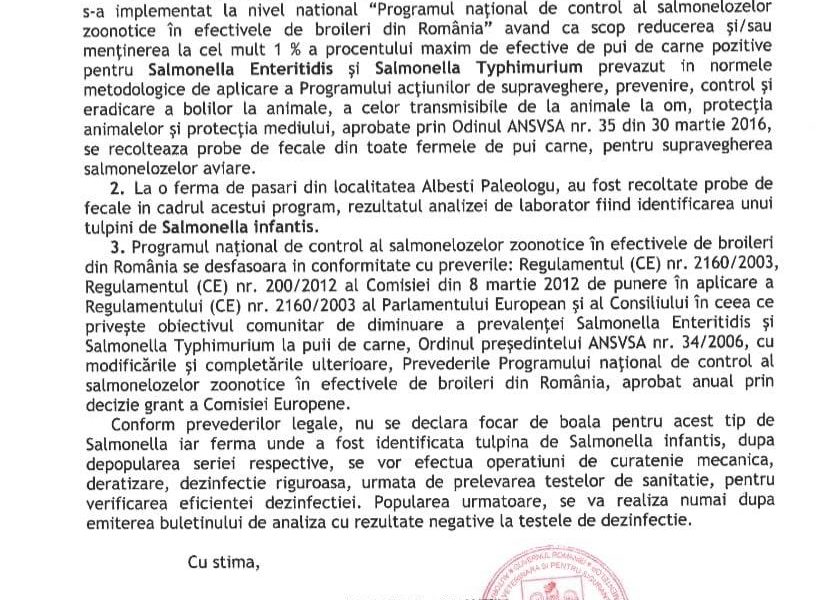 Conform prevederilor legale, nu se DECLARA focar de boala pentru acest tip de Salmonella iar ferma unde a fost identificata tulpina de Salmonella Infantis, dupa depopularea seriei respective, se vor efectua operatiuni de curatenie mecanica, deratizare, dezinfectie riguroasa, urmata de prelevarea testelor de sanitatie, pentru verificarea eficientei dezinfectiei. Popularea urmatoare, se va realiza numai dupa emiterea buletinului de analiza cu rezultate negative la testele de dezinfectie”.