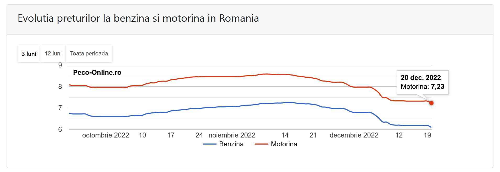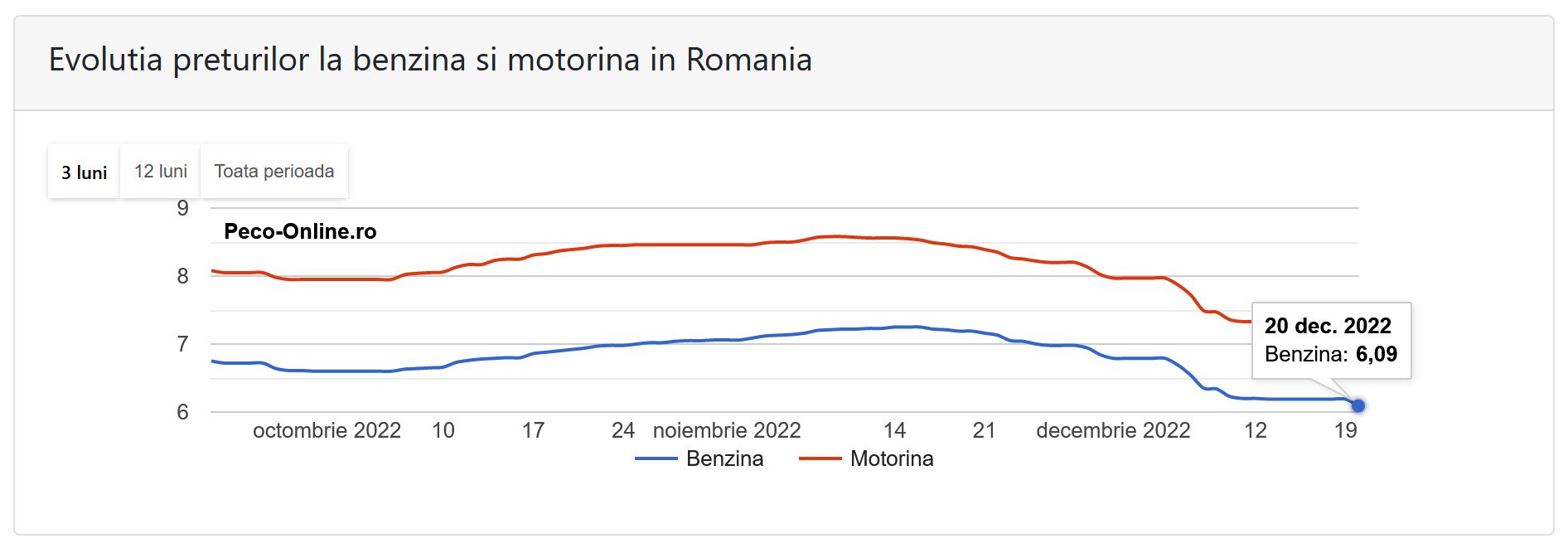 La data de 20 decembrie, prețul mediu al unui litru de motorină standard era de 7,23 de lei potrivit datelor Peco-online.ro, în timp ce prețul mediu al unui litru de benzină standard era de 6,09 lei.