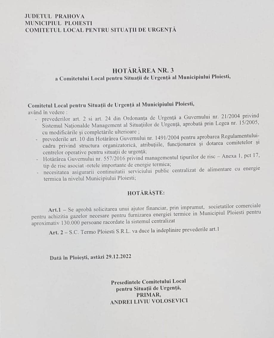 Cu o hotarare bizara a Comitetului Local pentru situatii de Urgenta al Municipiului Ploiesti, cu o hotarare AGA si o hotarare a CA de la Termo Ploiești si fara aprobarea C.L. Ploiesti s-a ajuns ca operatorul de termoficare să se împrumute, in mod ilegal, de la o societate comercială non-bancară. Despre legile incalcate si incadrarea juridica a faptelor vom reveni intr-un articol separat. Avizul Prefecturii Prahova a fost emis in mod legal, in rest… doar o “sarabanda” a ilegalitatilor.