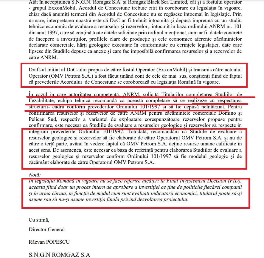 Conform celor de la Romgaz, draft-ul iniţial al DoC-ului propus de către fostul Operator (ExxonMobil) şi transmis către actualul Operator (OMV Petrom S.A.) a fost făcut ţinând cont de cele de mai sus, conştienţi fiind de faptul că prevederile Acordului de concesiune se coroborează cu legislaţia Română în vigoare.