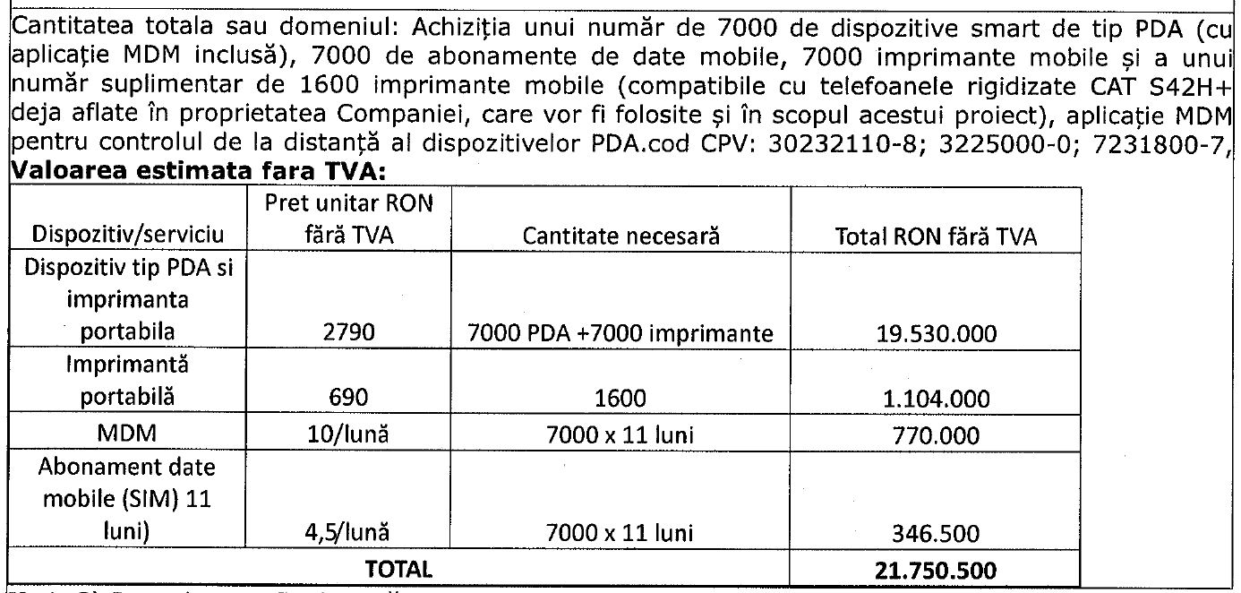 - În acest context, la nivelul companiei este necesară achiziția celor 7.000 de dispozitive ridigizate cu sistem Android și capabilități de scanare coduri de bare, aplicație MDM pentru administrarea dispozitivelor de la distanță, 7.000 de imprimante portabile și date mobile pentru cele 7.000 de dispozitive, distribuirea lor către personalul companiei și efectuarea unui training pentru utilizarea dispozitivelor și a aplicației.