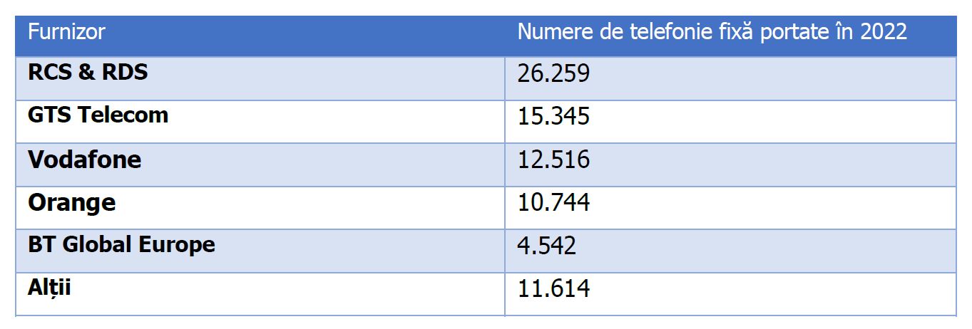 În anul 2022 au crescut semnificativ (cu peste 30%) și portările numerelor de telefonie fixă. Astfel, în acest an, au fost portate 81.020 de numere de telefonie fixă. Majoritatea utilizatorilor au optat pentru ofertele următorilor furnizori: RCS & RDS (26.259 numere), GTS Telecom (15.345), Vodafone (12.516), Orange (10.744) și BT Global Europe (4.542).