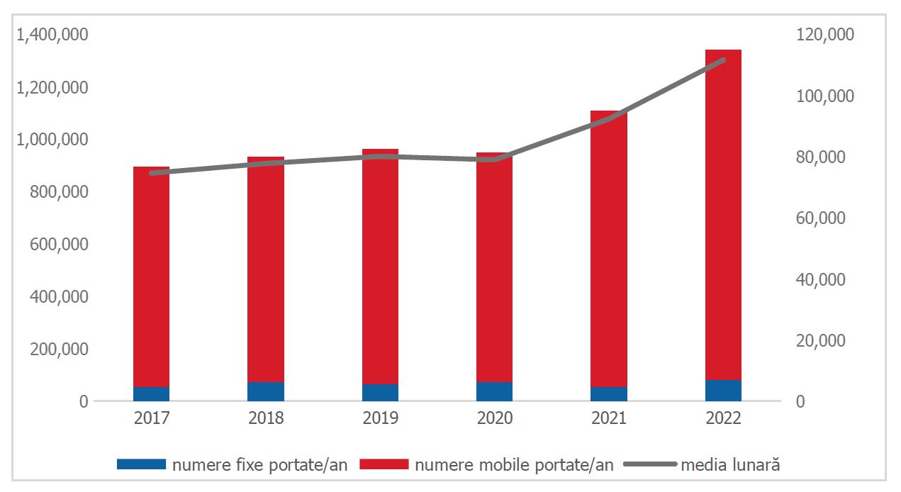 În anul 2022 au fost portate 1.255.962 de numere de telefonie mobilă. RCS & RDS este furnizorul care a primit, prin portare, cele mai multe numere mobile, respectiv 754.833, fiind urmat de Vodafone cu 191.822 numere primite și Orange cu 149.361.