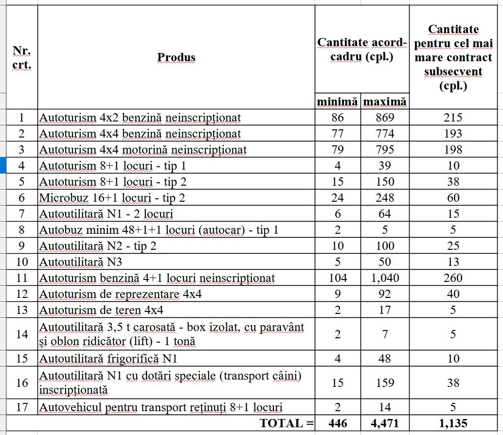 Potrivit datelor din SEAP, Direcția din MAI va încheia acorduri-cadru de furnizare de autovehicule, câte unul pentru fiecare lot în parte, cu maximum trei ofertanți, în ordinea clasării lor pe lotul respectiv, care să fie valabile pentru o perioada de 24 de luni de la data semnării acestora, în vederea completării dotării pe linie de asigurare a mobilității terestre a misiunilor structurilor/instituţiilor din cadrul/subordinea M.A.I..