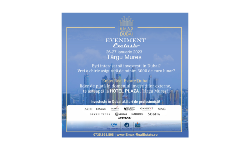 Emax Real Estate Dubai, în parteneriat cu cei mai mari dezvoltatori din Dubai, printre care : Damac Properties, Sobha , Emaar, Azizi, organizează, în perioada 26-27 ianuarie 2023, la Hotel Plaza, Târgu Mureș, unul dintre cele mai mari evenimente din România dedicat vânzării de imobiliare în Dubai! Evenimentul se va desfășura între orele 10:00-20:00.