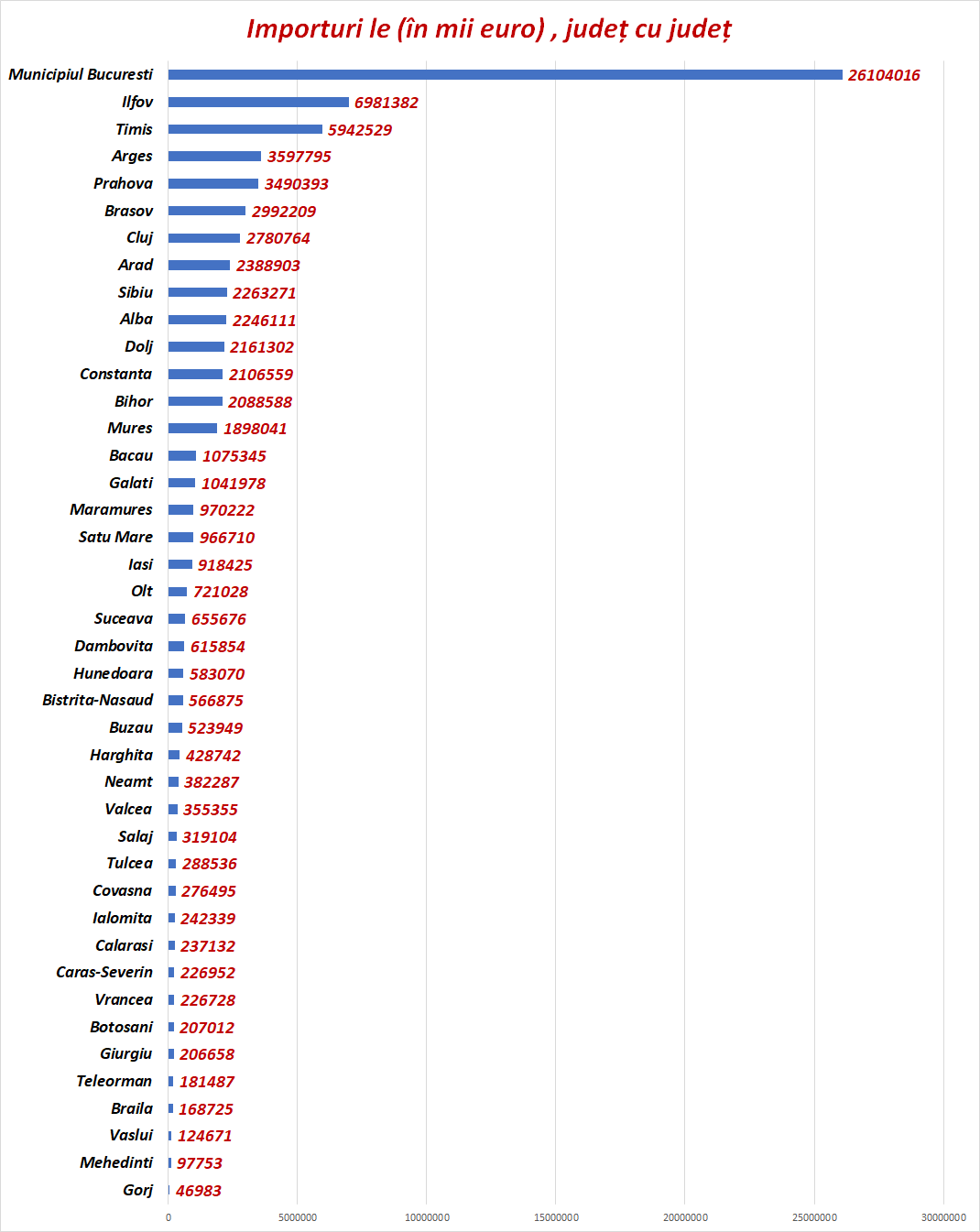 Cel mai mare importator la modul general, este Capitala. E urmat de Ilfov, Timiș, Argeș și Prahova.Vaslui, Mehedinți și Gorj stau la coada clasamentului.