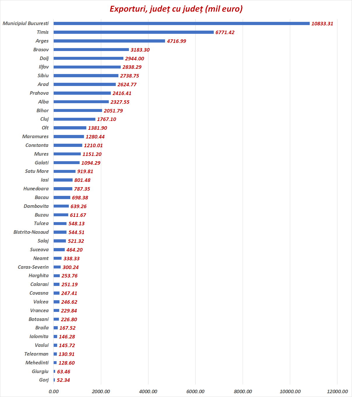 La capitolul exporturi, tot București dictează ritmul dansului. Dar nu mai e urmat de Ilfov, ci de Timiș, Argeș și Brașov, fiecare județ având puternice companii străine care produc pentru export.Mehedinți, Gorj și Giurgiu au cele mai mici exporturi.