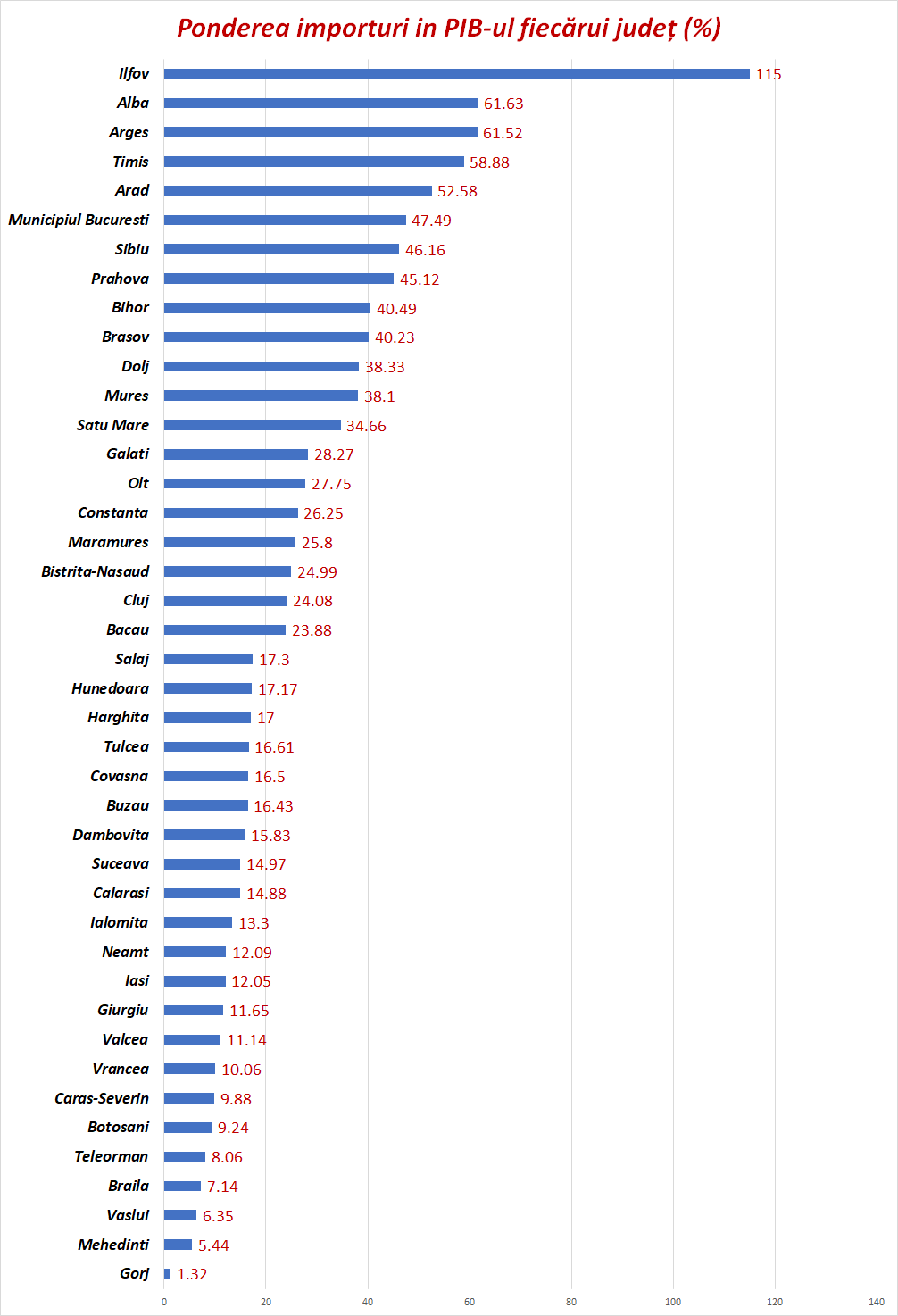 Ne-am mai uitat la un indicator: importurle ca pondere în PIB-ul fiecărui județ. Ilfovul e campion: importă 115% din cât produce. Alba e al doilea județ care pare dependent de importuri, cu aproape 62% din PIB marfă adusă din afara țării.