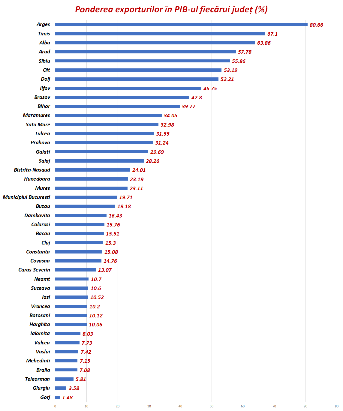 De asemenea, ne-am uitat la ponderea exporturilor în PIB-ul fiecărui județ. Argeș eputernic dependent de exporturi: peste 80% din PIB (echivalent) merge la export. Asta poate constitui și o vulnerabilitate, pentru că în cazul în care Renault (Dacia) se mută prin absurd în alt județ, exporturile argeșene se duc în nas.