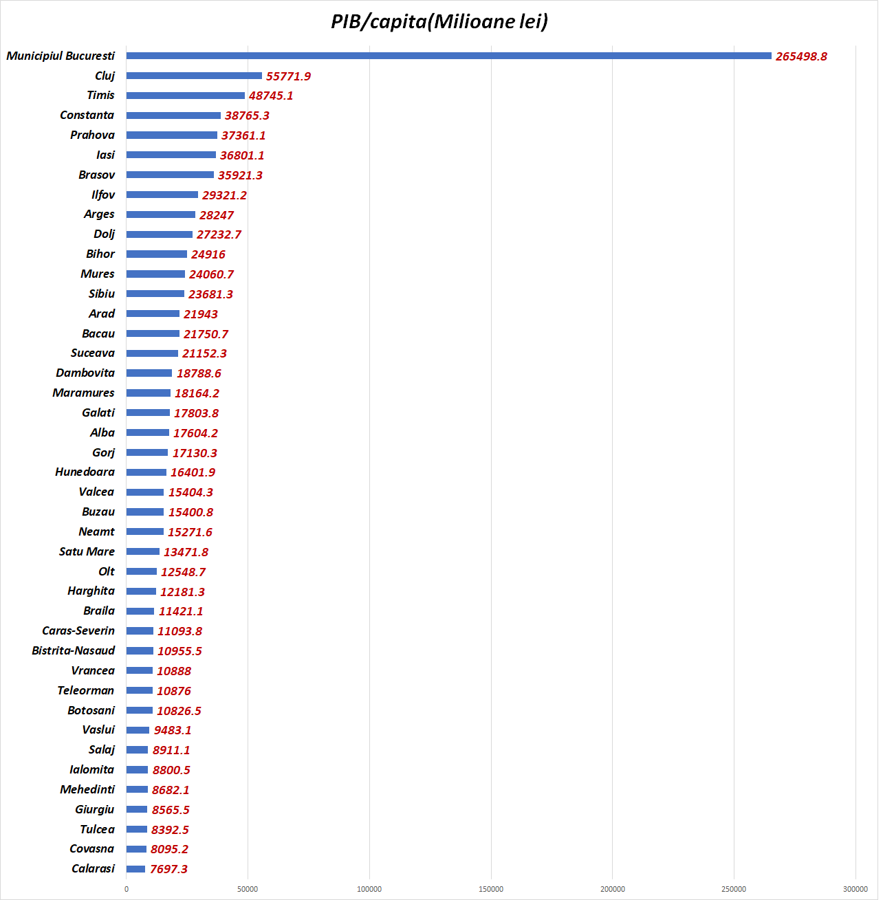 Si ultimul grafic este cel al PIB/capita, județ cu județ. Un fel de grafic al bogăției/sărăciei locuitorilor României din fiecare județ.