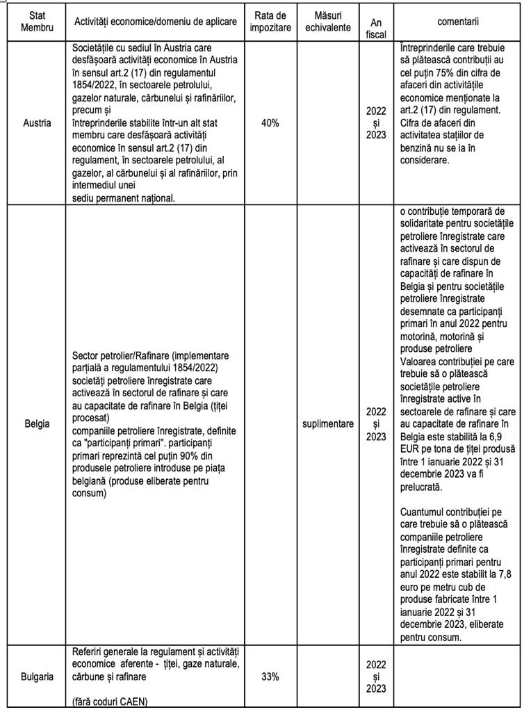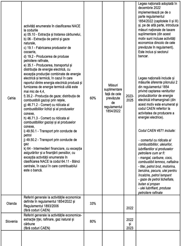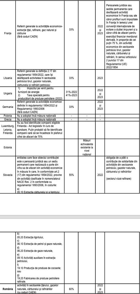 Guvernul a adoptat la finalul anului trecut o OUG (186/2022) prin care extra-profiturile producătorilor de țiței, gaze și rafinăriilor vor fi taxate cu 60%, punând în aplicare un regulament european în acest sens. Vizate potrivit ordonanței sunt companiile care au 75% din cifra de afaceri din sectoare definite cu codurile CAEN extractia titeiului, extractia gazelor naturale, extractia huilei, fabricarea produselor de cocserie și fabricarea produselor obtinute din rafinarea petrolului. OMV a anunțat la începutul anului că nu se încadrează.