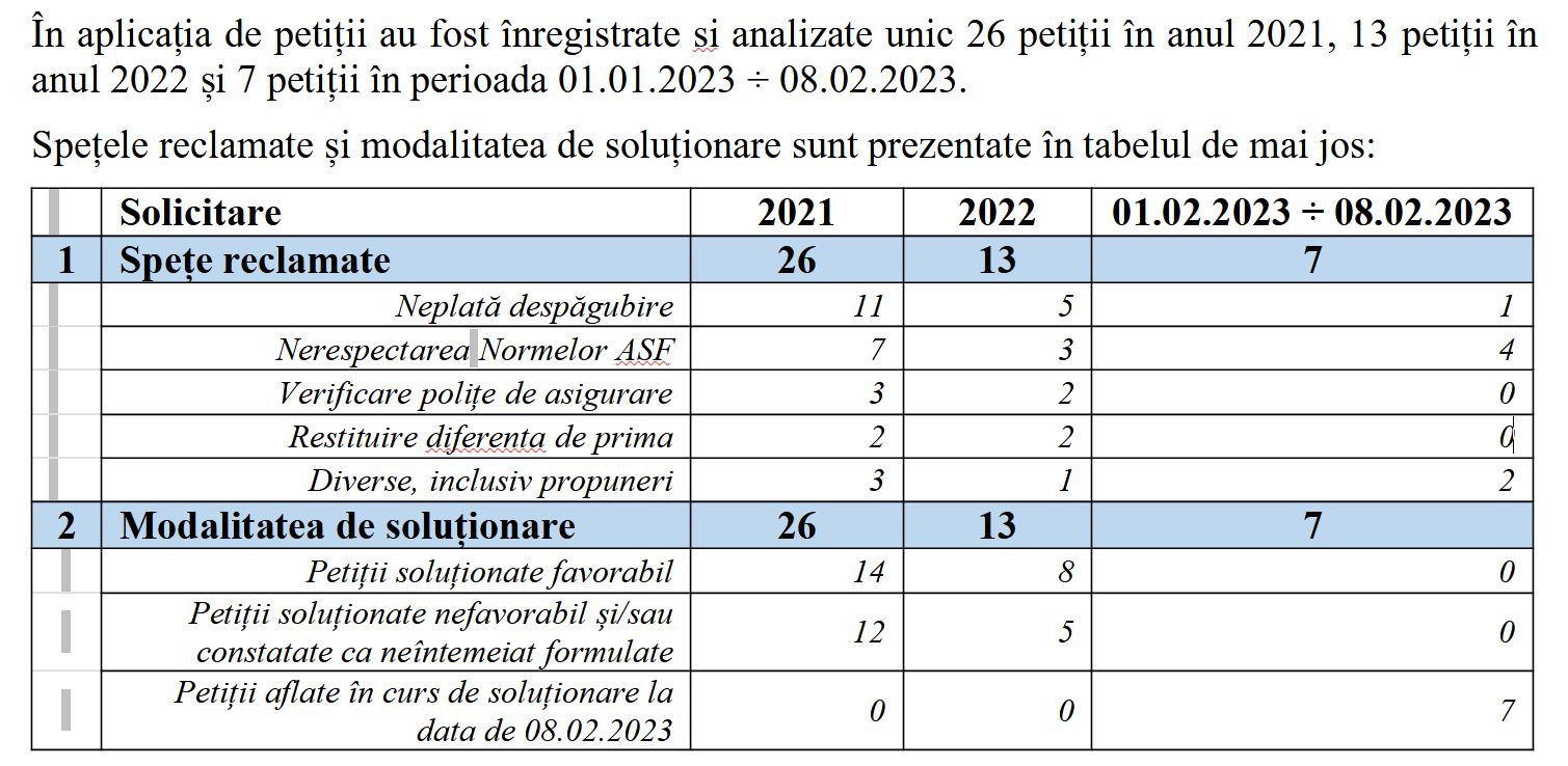 Astfel, în anul 2021 – 14 din cele 26 de reclamații au fost soluționate în favoarea petenților, în timp ce anul trecut a dat dreptate asiguraților în 8 din cele 13 reclamații.
