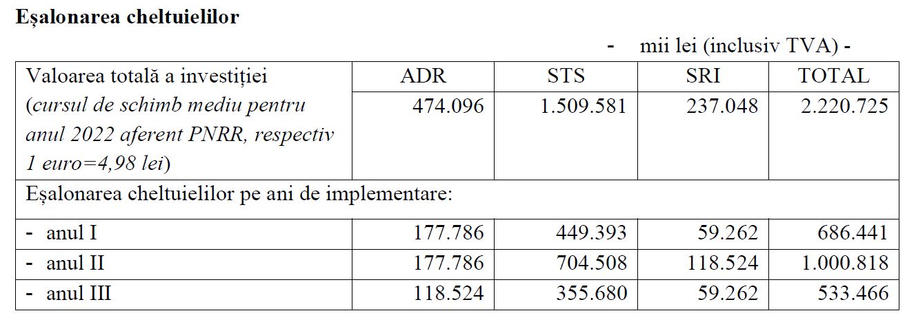 Eșalonarea cheltuielilor pe 3 ani de implementare arată că cei mai mulți bani vor fi necesari STS – peste 1,5 miliarde de lei, în timp ce ADR estimează cheltuieli de peste 474 milioane de lei, iar SRI – peste 237 milioane de lei.