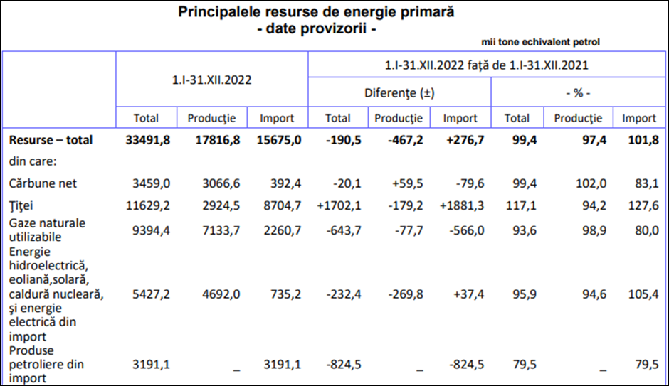 Producția și consumul total de resurse enegretice au scăzut și ele cu 467 000 toep (tone echivalent petrol), respectiv cu 190 000 toep: