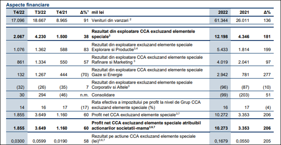 Petrom, cea mai mare companiei românească a realizat, în 2022, cea mai mare cifră de afaceri atinsă vreodată de o firmă din România (61 de miliarde de lei- peste 12 miliarde de euro), dar și cel mai mare profit din toate timpurile realizat de o companie aici (10,2 miliarde de lei- peste 2 miliarde de euro):