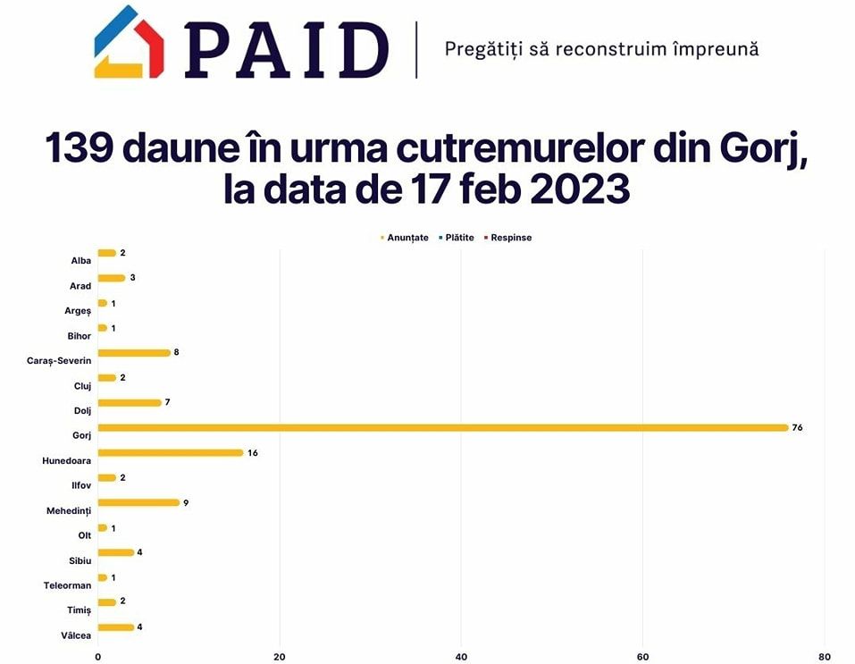 Până la data de 17.02.2023 s-au deschis 139 dosare de daună în urma cutremurelor din Gorj, produse în zilele de 13 și 14 februarie, a anunțat pe Facebook PAID (Pool-ul de Asigurare Împotriva Dezastrelor), societatea privată de asigurări care emite polițele PAD de asigurare obligatorie a locuințelor și plătește despăgubirile în caz de dezastre.