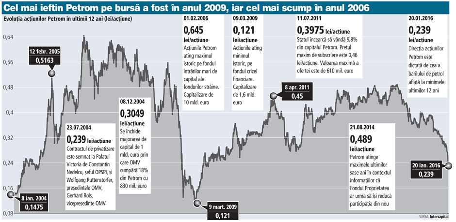 Anul trecut capitalizarea bursieră a fost de nici 6 miliarde de euro, iar valoarea acțiunii a oscilat în jur de 0,45 lei/acțiune.