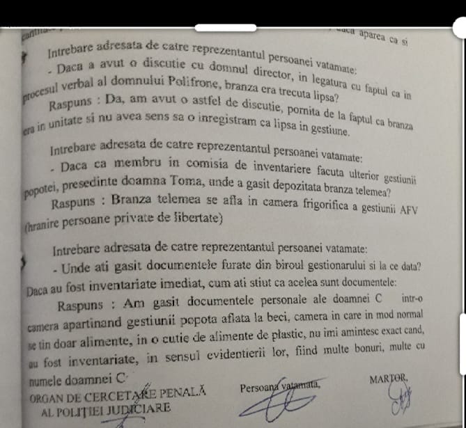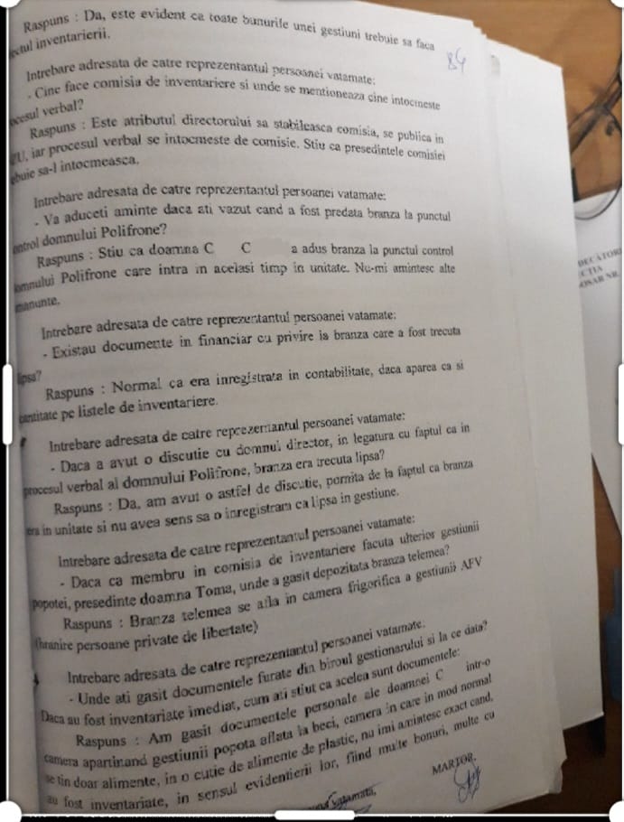 „Am sugerat în luna mai 2019, în repetate rânduri doamnei Dănescu Izabela de a constitui, conform HG 1846 art 34 alin 3 care prevede că ,, în cazul bunurilor uzate fizic înainte de expirarea duratei normate de funcționare, utilizare și care nu mai pot fi folosite conform destinației, pentru care au fost create, comisia de inventariere face o mențiune în acest sens în procesul verbal de inventariere, în vederea efectuării cercetării administrative pentru stabilirea cauzelor și răspunderilor”, mai spicuim din declaratia persoanei prejudiciate.