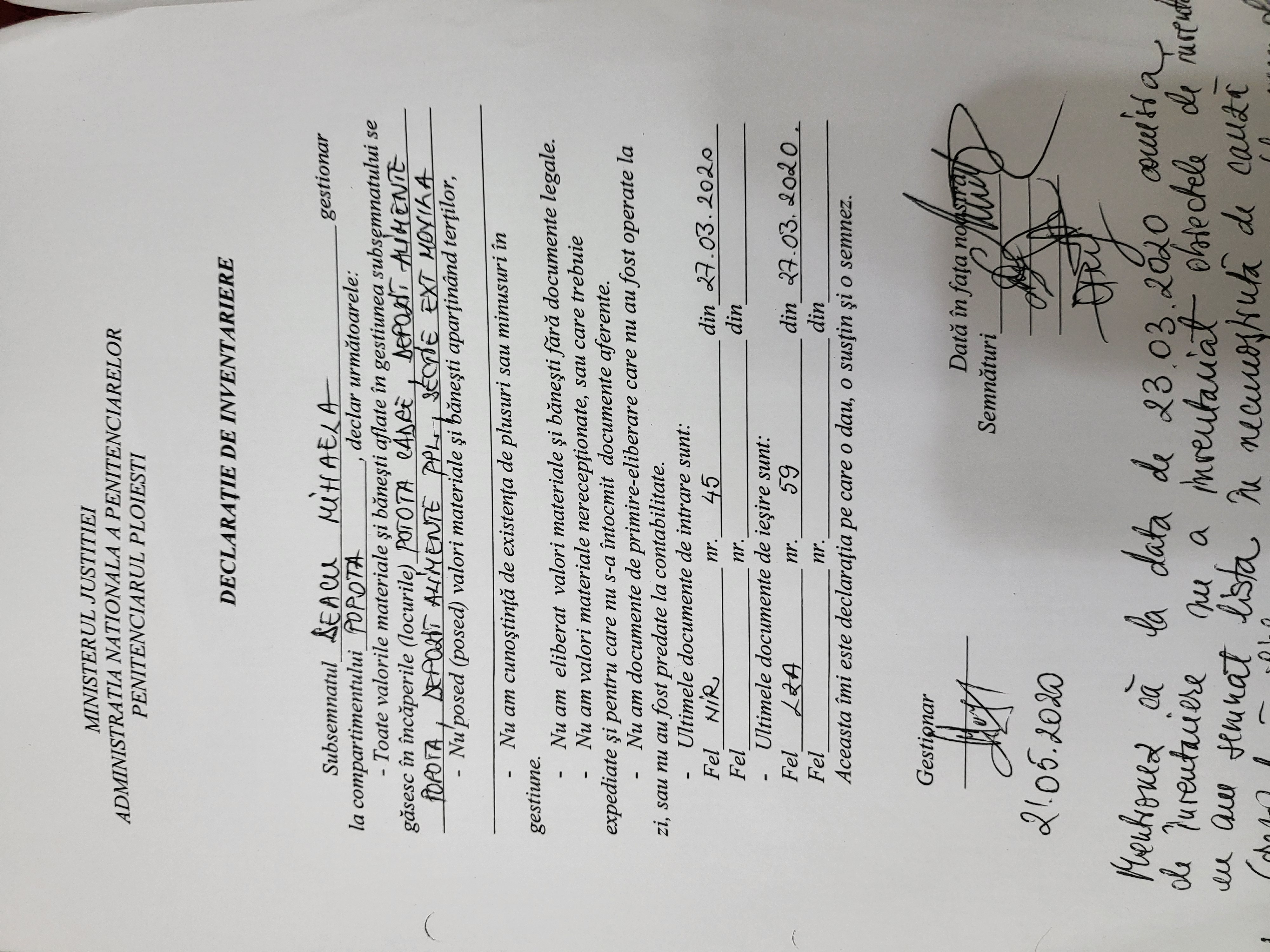 Prin adresa B2/3263/3270/04.11.2020, Penitenciarul Ploiești, recunoaște faptul că a fost necesară constituirea unei noi comisii, numită de director prin DZU din 01.04.2020 președinte director adjunct Toma Magdalena, citam ”pentru falsificarea evidentă și nerespectarea prevederilor legale privind inventarierea” întrucât comisia din 23.03.2020, condusă de Polifrone Ciprian a încălcat prevederile legale.