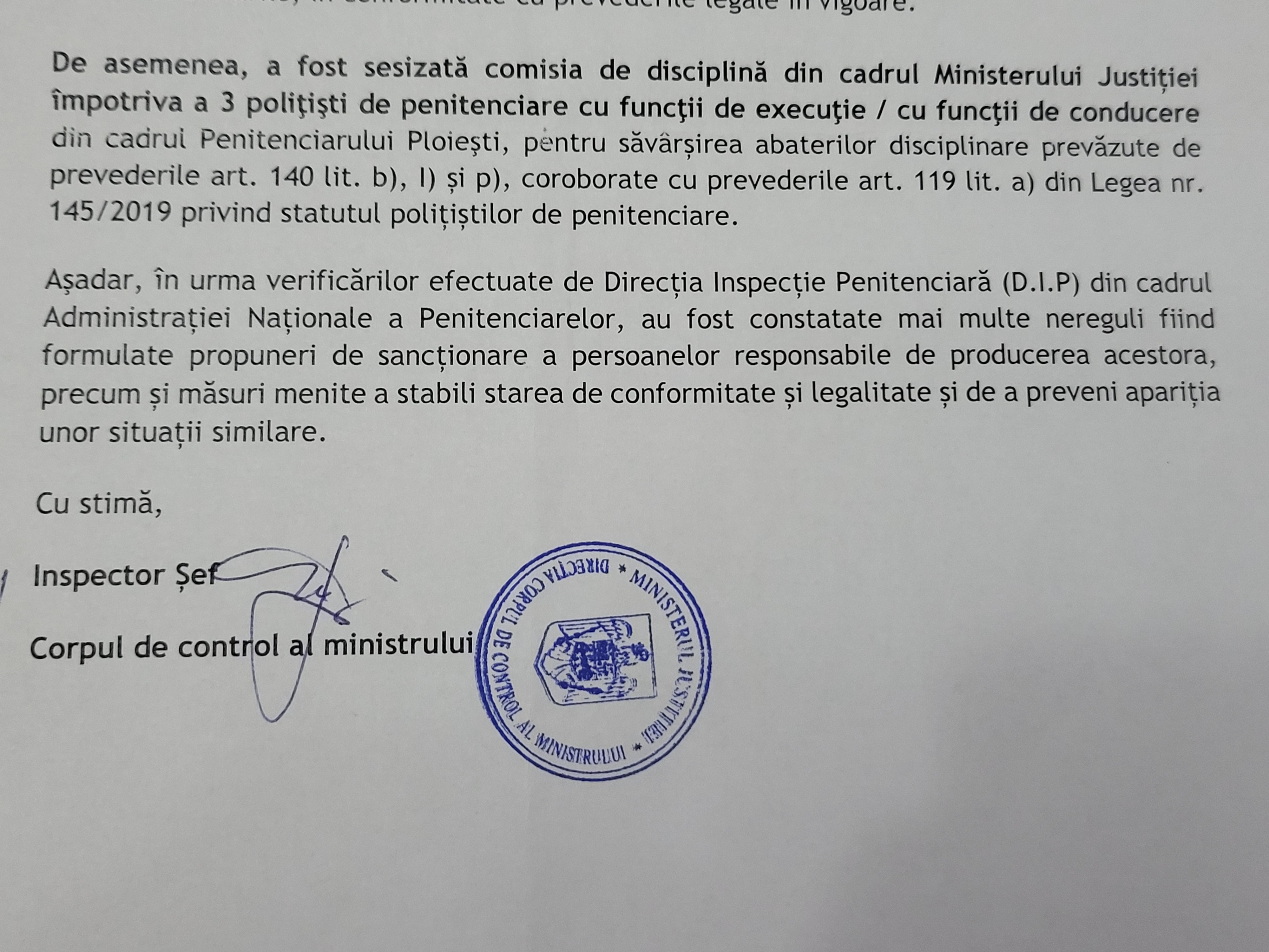 Prin adresa nr H/101136/782/P/2020/29.01.2021, Corpul de Control al Ministrului Justitiei. sub semnatura, recunoaste ca a fost sesizata comisia de disciplina din cadrul MJ impotriva a 3 politisti de penitenciare cu functii de executie/cu functii de conducere din cadrul Penitenciarului Ploiesti pentru abateri disciplinare care in opinia noastra si a judectorului de camera preliminara sunt infractiuni. Printre cei vizati de comisia de disciplina era si simpaticul nostru imputernicit la comanda unitatii, Comisarul șef de poliție penitenciară Valentin MATEI.
