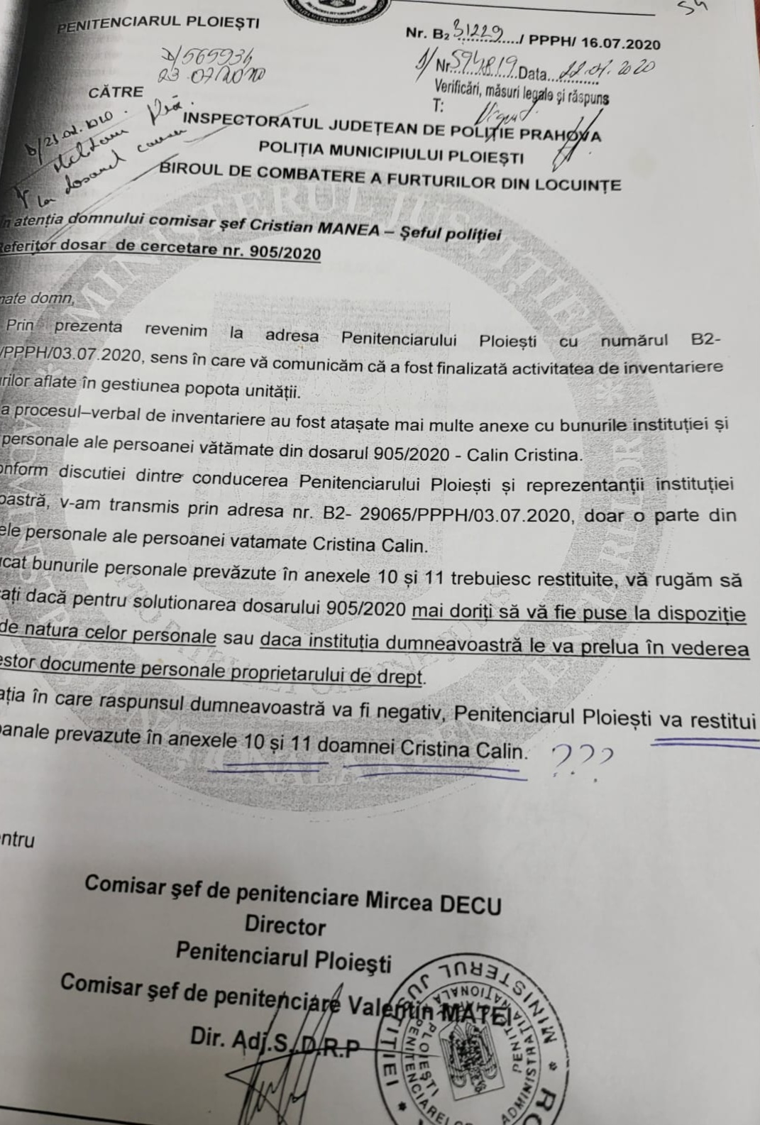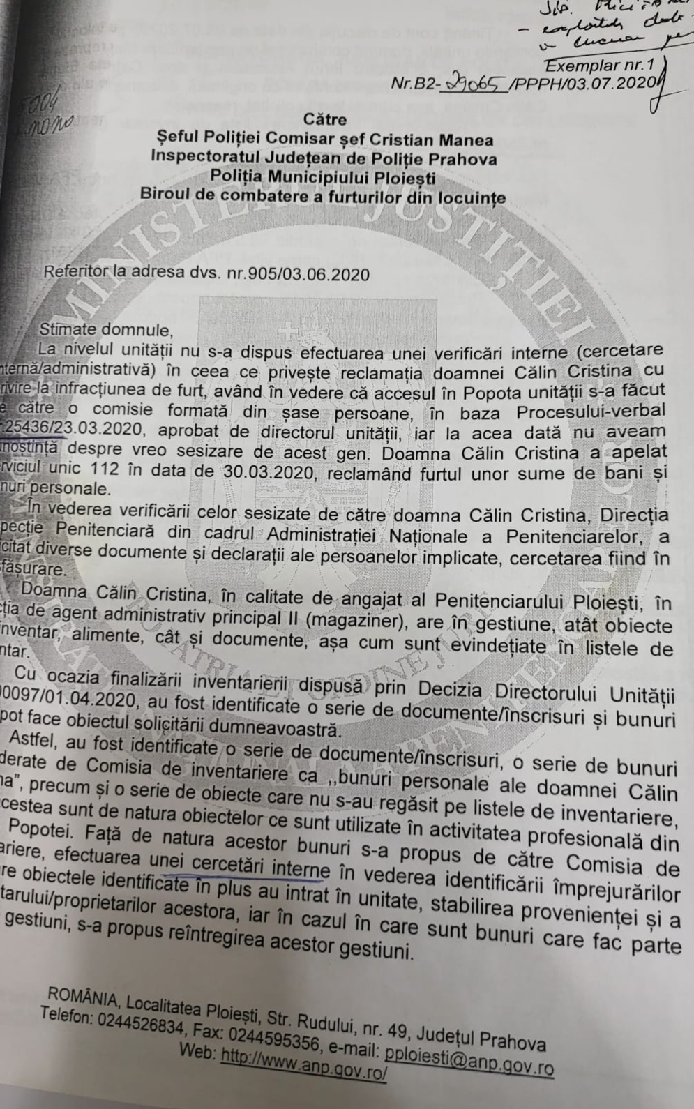 ,,Conform discuției dintre conducerea Penitenciarului Ploiești și reprezentanții instituției dvs, v-am transmis prin adresa B2-29065/PPPH/03.07.2020 , doar o parte din documentele personale ale persoanei vătămate Cristina Călin.,,