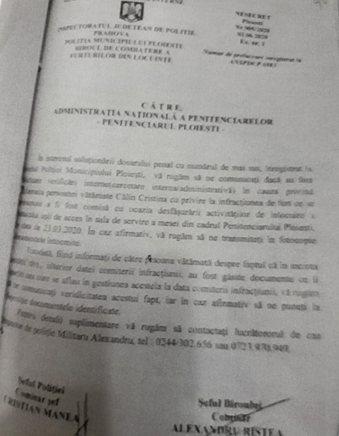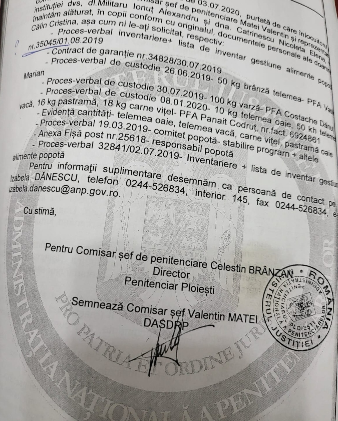 - Adresa B2-29065/PPPH/03.07.2020 privind înțelegerea penală ??? dintre înlocuitorul la comanda penitenciarului Matei Valentin și Sinsp. Militaru Alexandru, însoțit de Student Catrinescu Nicoleta Elena.