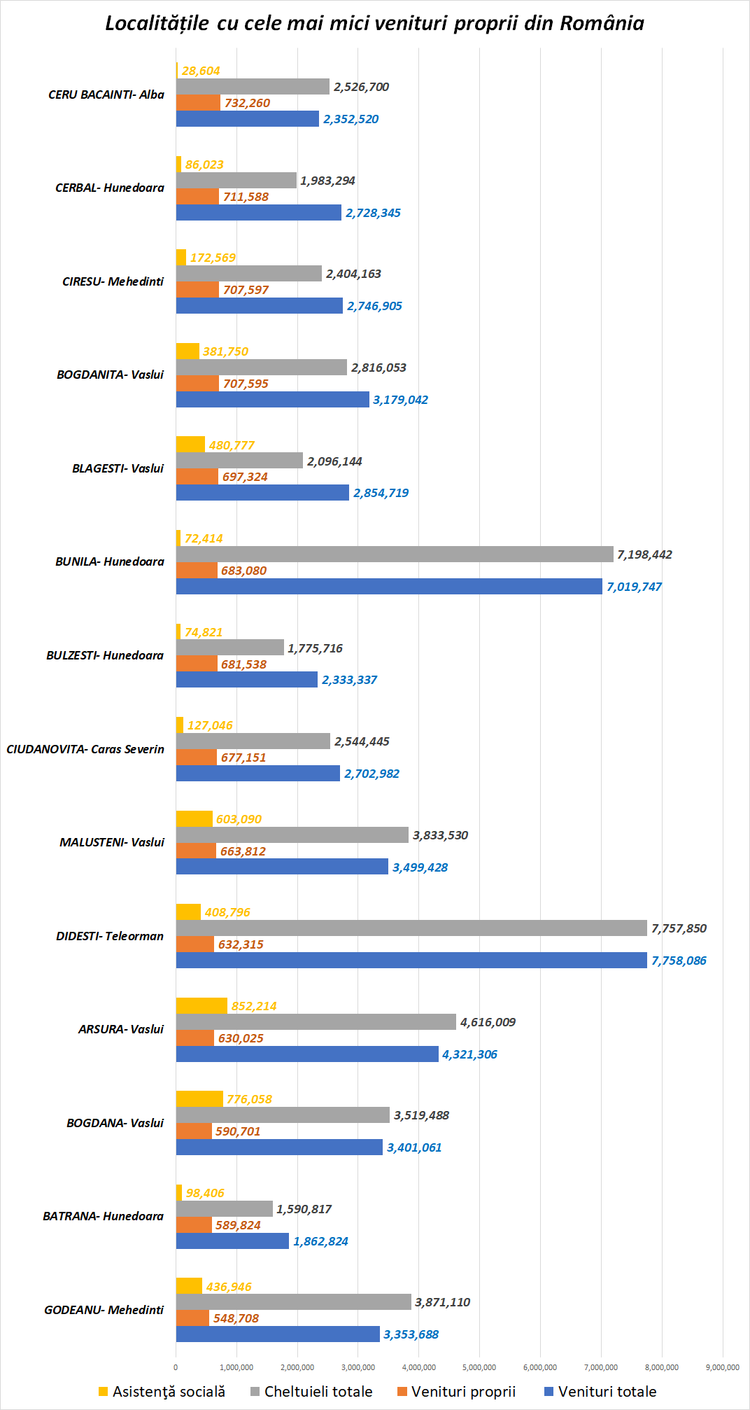Pe lista localităților cu venituri mici urmează două așezări din Vaslui: Bogdana și Arsura. În cazul primeia, veniturile proprii sunt de circa 9800 de euro lunar, iar cheltuielile totale sunt de circa 60.000 de euro lunar (sau puțin peste 700.000 de euro anual, dacă rotunjim cifrele). Pe asistența socială în Bogdana se duc anual 150.000 de euro. Localitatea are 1313 suflete, conform Recensământului de anul trecut.