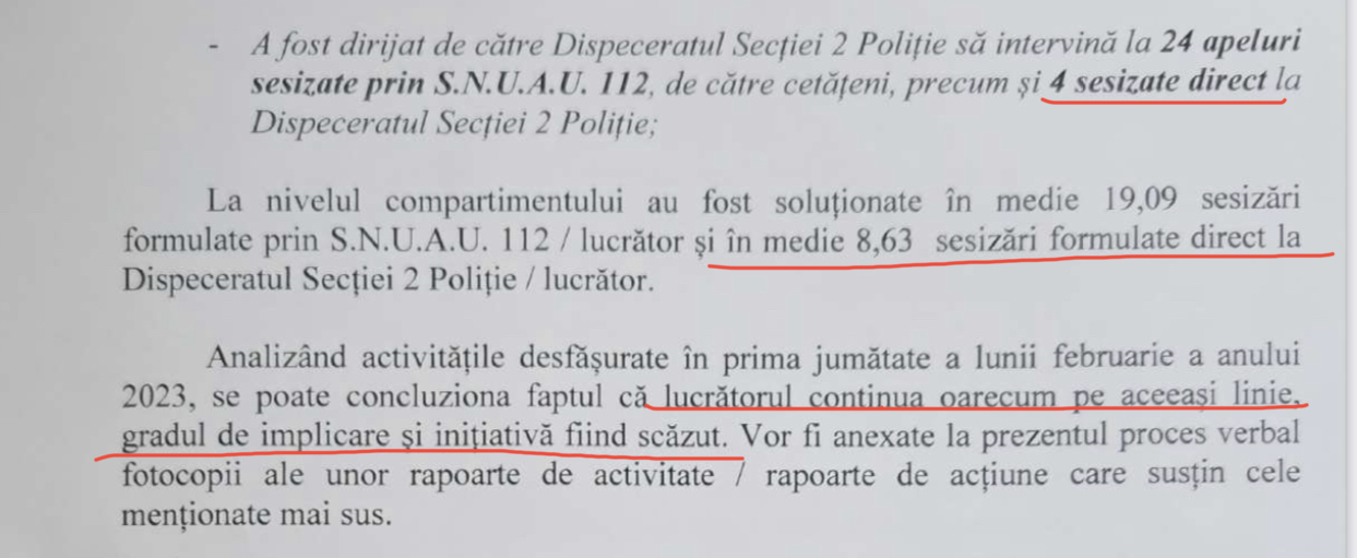 Următoarea critică, este de-a dreptul halucinantă și se referă la faptul că agentul în cauză a intervenit doar la 4 cazuri sesizate direct prin dispeceratul unității, în comparație cu colegii lui care au intervenit la 8,63 sesizări. Atenție, pentru ca toți cei care citesc aceste rânduri să înțeleagă despre ce este vorba, cei doi ofițeri îi reproșează agentului că pe durata serviciului său, nu au sunat mai mulți cetățeni la dispeceratul secției să sesizeze diverse. Păi în logica aceasta, îl vom îndruma pe polițist să îi roage pe apropiați/prieteni ca atunci când intră el în serviciu aceștia să sune la Poliție și să reclame fel de fel de fapte, pentru a se ridica și el la norma impusă de 8,63 intervenții.