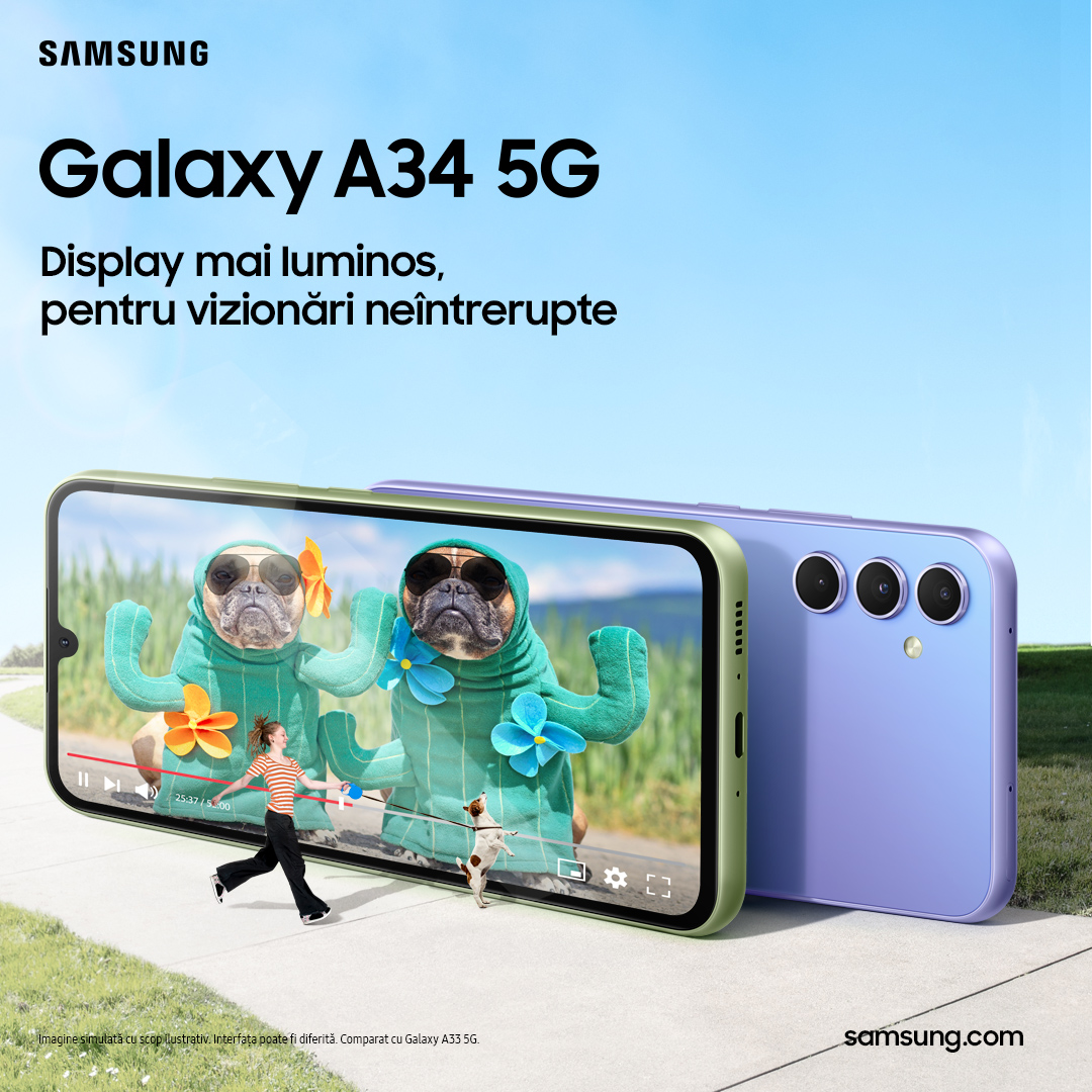 Galaxy A54 5G și A34 5G pot face videoclipuri extrem de clare, fără blur. Acest lucru se datorează stabilizării optice a imaginii, dar și stabilizării digitale a imaginii video îmbunătățite.