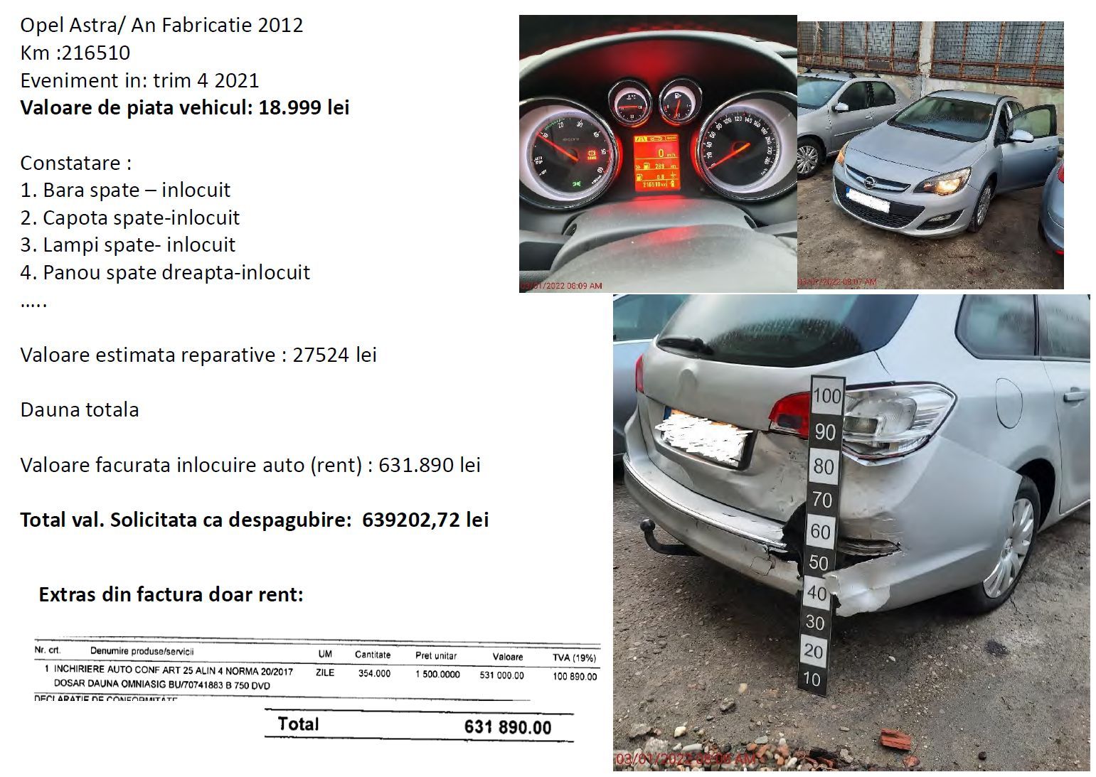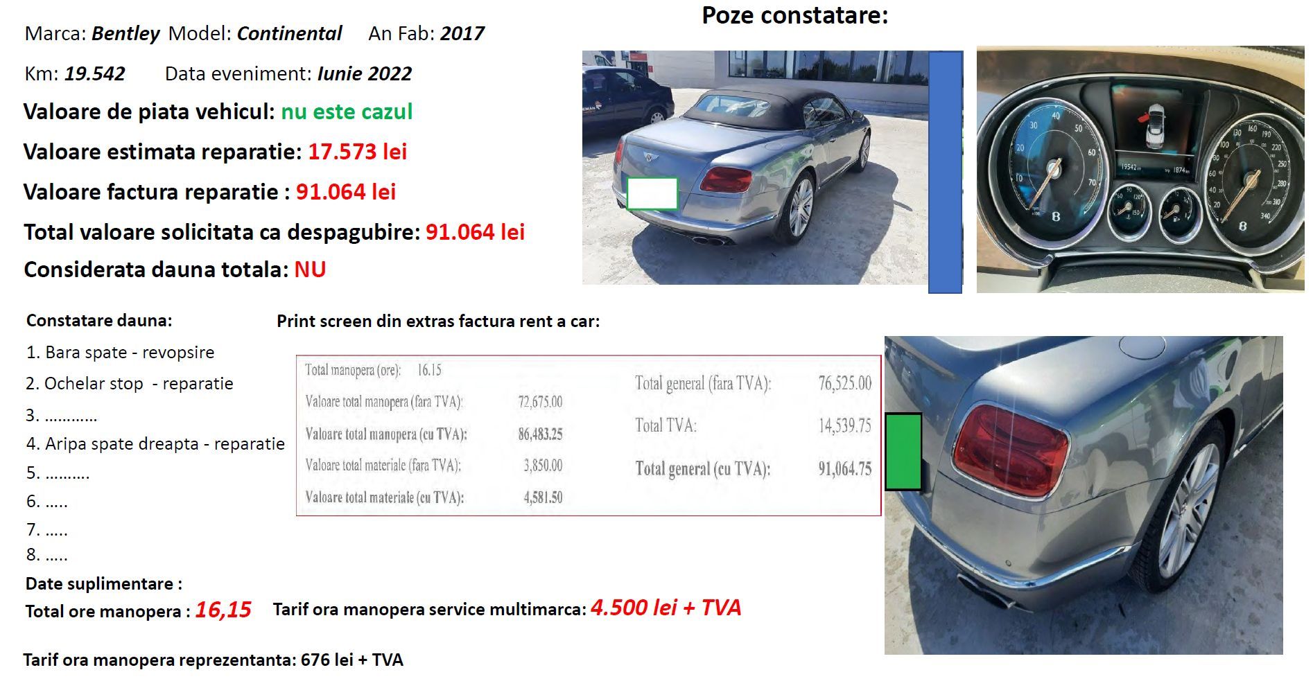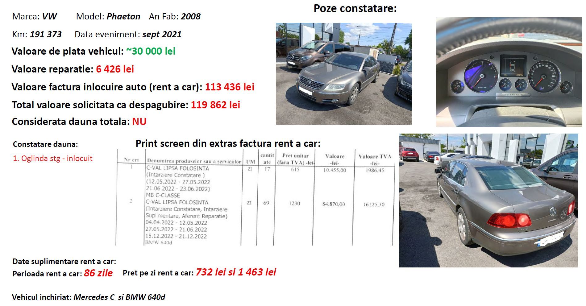 La costul de reparație s-a adăugat și factura de înlocuire mașină (rent a car) care a fost de 90.190 de lei pentru 53 de zile cât a stat mașina avariată în service.