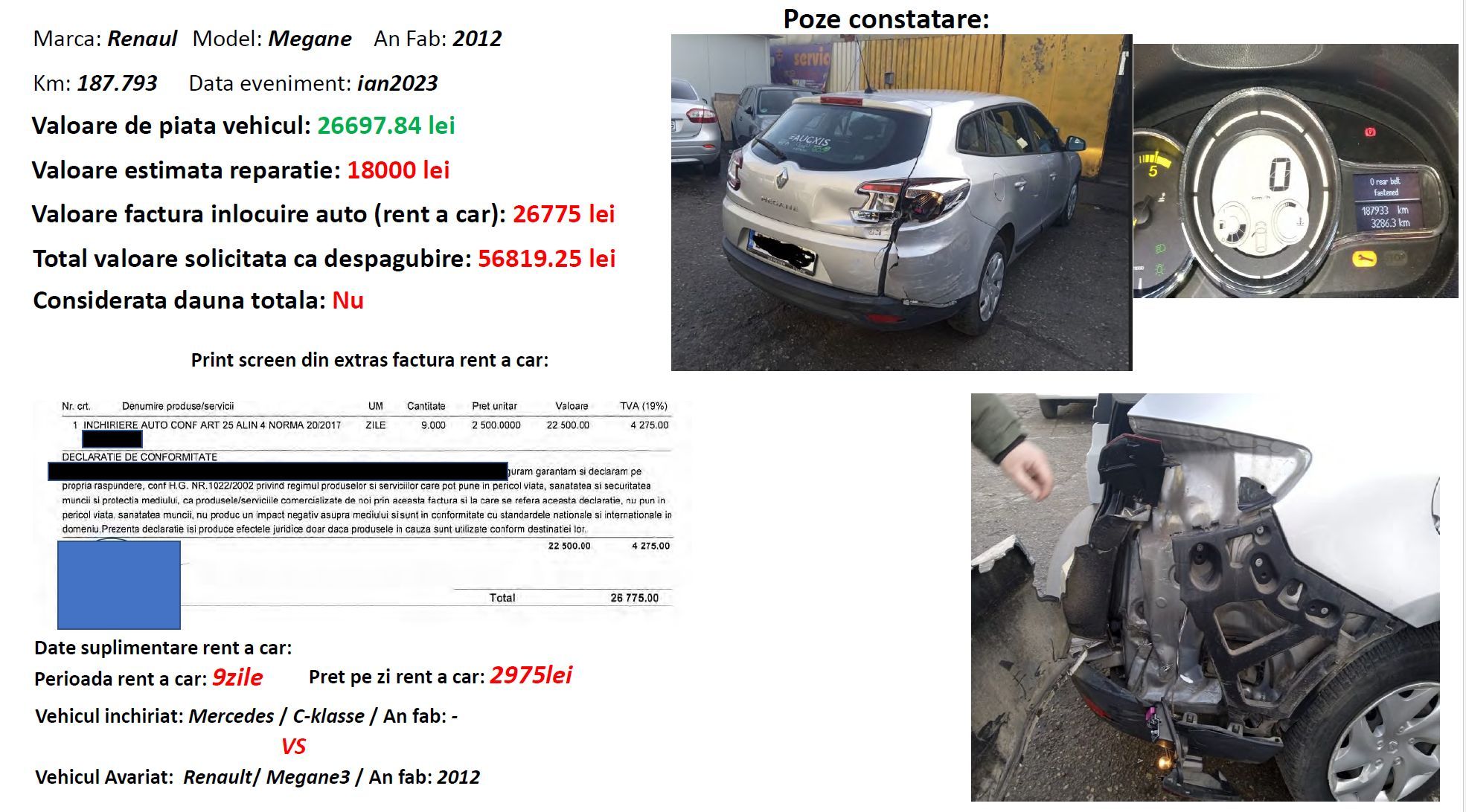 Pentru 9 zile prețul tarifat de service pentru mașina dată la schimb a fost de 2.975 de lei pe zi, astfel că valoarea totală solicitată spre despăgubire a ajuns la 56.819 lei, de 2 ori valoarea de piață a mașinii.
