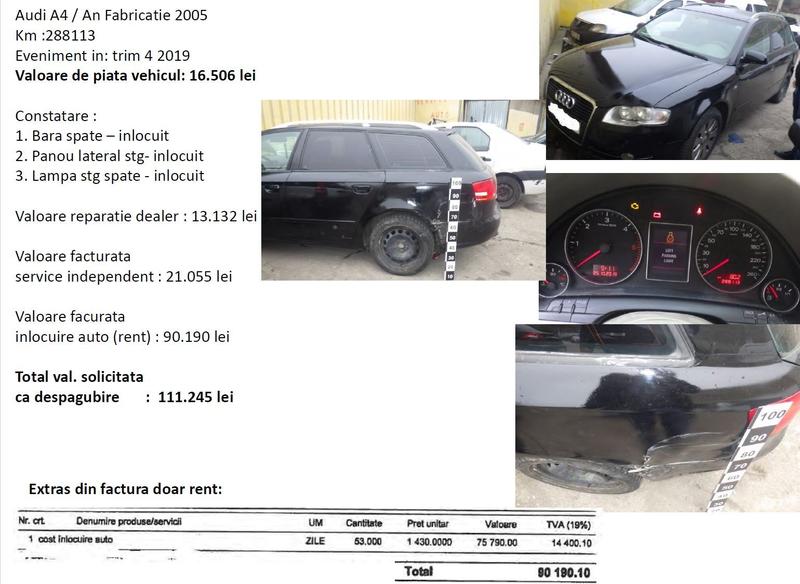Unul dintre cazurile prezentate vizează reparația unui Audi A/4, fabricat în 2005, a cărui valoare de piață este de peste 16.500 de lei.