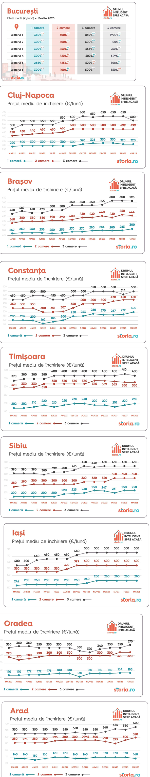 În luna martie, prețurile chiriilor din cele mai mari orașe din țară s-au menținut în general constante, comparativ cu luna anterioară. Cele mai mari scăderi ale chiriilor au fost observate în cazul apartamentelor de trei camere din Cluj-Napoca, unde prețul mediu solicitat este cu aproximativ 8% mai mic, dar și în Arad, în cazul garsonierelor, unde prețul mediu a scăzut cu 6%. În același timp, cele mai mari creșteri de la o lună la alta s-au înregistrat în Constanța, la garsoniere (10%) și la apartamentele cu trei camere (7%), dar și în Arad la apartamentele cu două camere (7%).