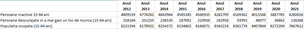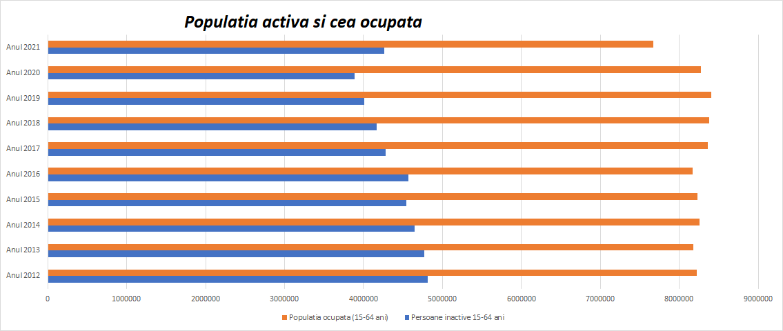 Avem peste 4 milioane de concetățeni (25-65 de ani) inactivi pe piața muncii. Numărul lor nu a variat foarte tare în ultimii ani, deși populația e în scădere. Persoanele ocupate sunt în număr de circa 7,7 milioane. Cu aproape un milion mai puține decât în urmă cu câțiva ani.
