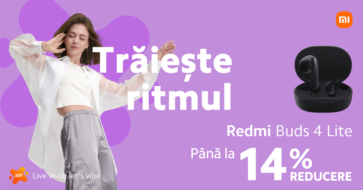 Redmi Buds 4 Lite reprezintă alegerea ideală pentru pasionații de muzică. Aceste căști wireless asigură experiențe de ascultare imersive, distorsiuni reduse ale sunetului, un bas mai bogat și tonuri înalte mai clare. În plus, sunt foarte ușoare, doar 3.2 grame și au certificare IP54 de rezistență la apă. În perioada Xiaomi Fan Festival, prețul Redmi Buds 4 Lite este unul imbatabil: 129 de lei.