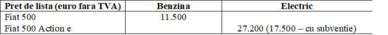 Analizând prețurile de listă pentru un Fiat 500 pe benzină și electric vedem că aceeași mașină costă cu 136% mai mult fără subvenție și cu 52% mai mult cu subvenție.