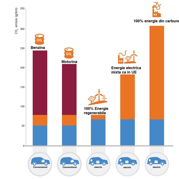 Fazele legate de vehiculele electrice, includ: producția de energie electrică, transportul pe rețea, transformarea de către motor a energiei electrice stocate în baterii în energie mecanică.