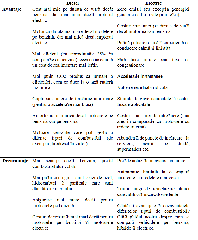 Costuri cu energia. Dieselul este cel mai scump tip de combustibil pe care îl puteți pune într-o mașină din cauza cererii mari pe piață, dar și a impozitării mai mari pe care o primește din cauza „murdăriei” percepute. Un alt motiv este faptul că mașinile diesel sunt în scădere în popularitate, pe măsură ce creșterea popularității vehiculelor electrice și a modelelor pe benzină eficiente cu motoare mici continuă. Mașinile electrice primesc o mare parte din aprecieri datorită costurilor de încărcare mici. Acest lucru se datorează în mare parte extinderii infrastructurii pentru încărcătoarele pentru vehicule electrice și disponibilității pe scară largă a energiei electrice. În unele cazuri, veți putea folosi încărcarea gratuită, care poate fi găsită la locurile de muncă sau supermarketuri.