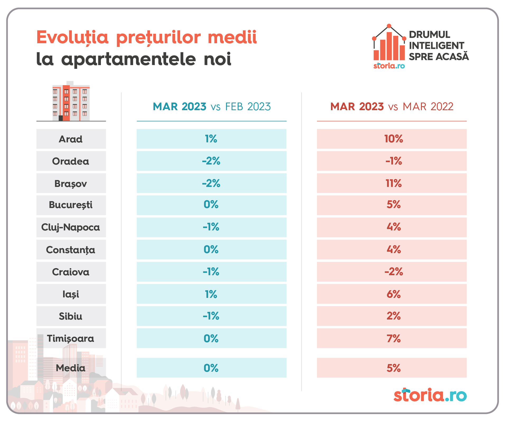 În TIMIȘOARA, prețurile apartamentelor vechi au scăzut cu 1% în martie 2023, dar au crescut cu 5% față de anul 2022, în timp ce prețurile apartamentelor noi din Timișoara au rămas la fel în luna martie, dar sunt cu 7% mai mari față de luna martie a anului trecut.