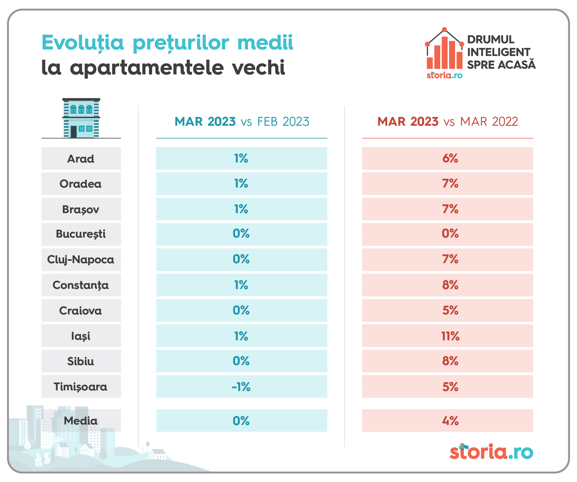 ARAD: În luna martie, prețul mediu pe metru pătrat ponderat pentru apartamentele vechi a crescut cu 1% față de luna anterioară și cu 6% față de aceeași perioadă a anului trecut. Prețul apartamentelor noi a crescut cu 1% față de luna precedentă și cu 10% față de anul anterior.