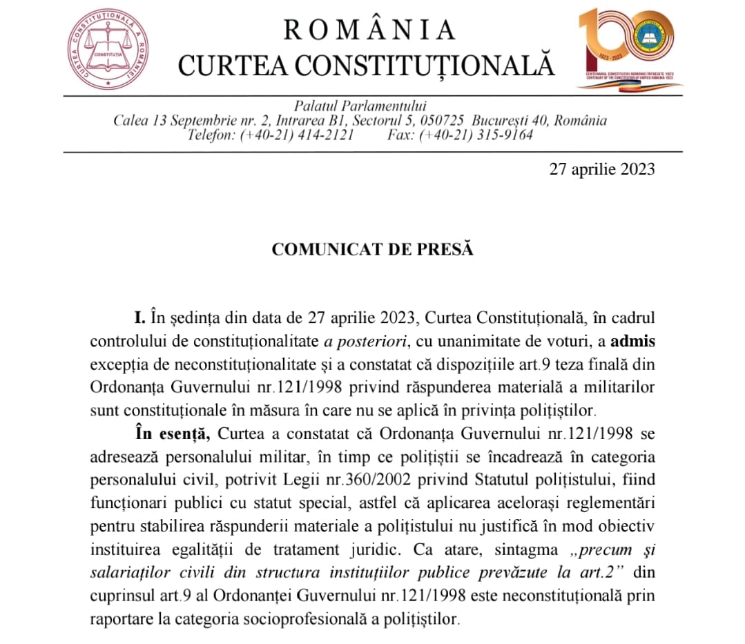 După ce în luna decembrie a anului trecut Curtea Constituțională a României declara ca fiind neconstituționale mai multe articole din OUG nr. 121/1998 privind răspunderea materială a militarilor, prin care polițiștii nu mai pot fi ”executați silit” de instituția angajatoare în urma cercetării administrative făcute ca judecata lui Ponțiu Pilat, ci de o instanță de judecată pentru a avea parte de un proces corect și echitabil, ieri, Curtea a lovit din nou in MAI, dezvaluie cei de la sindicatul Europol.