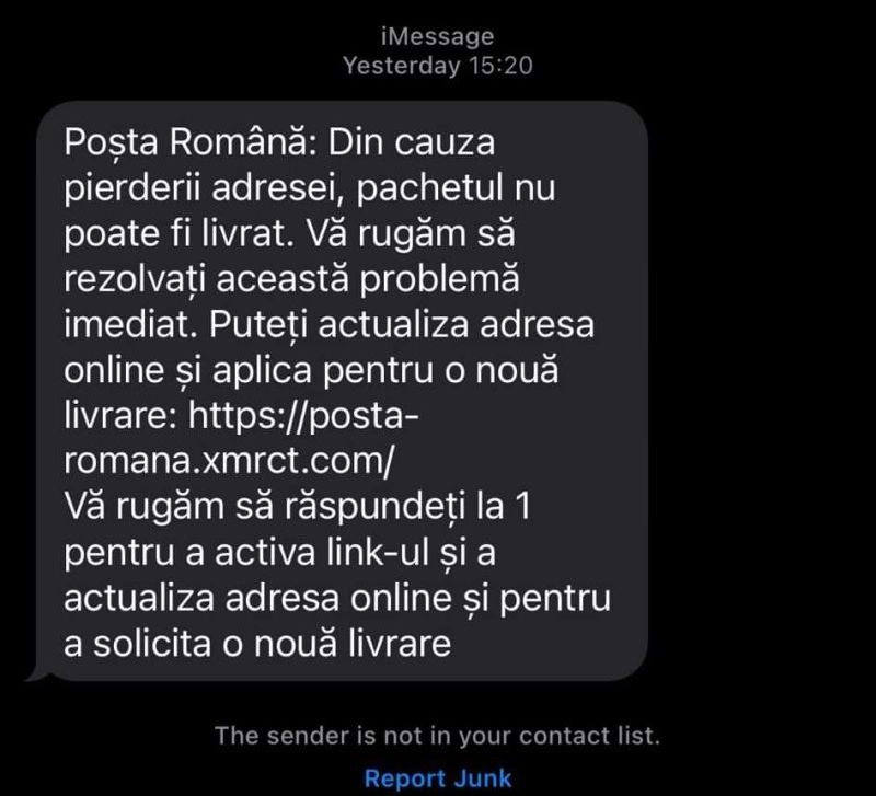 - „De pe un număr de telefon de România infractorii cibernetici trimit un SMS prin care destinatarului i se aduce la cunoștință faptul că trebuie să primească un colet, dar adresa este incorectă.