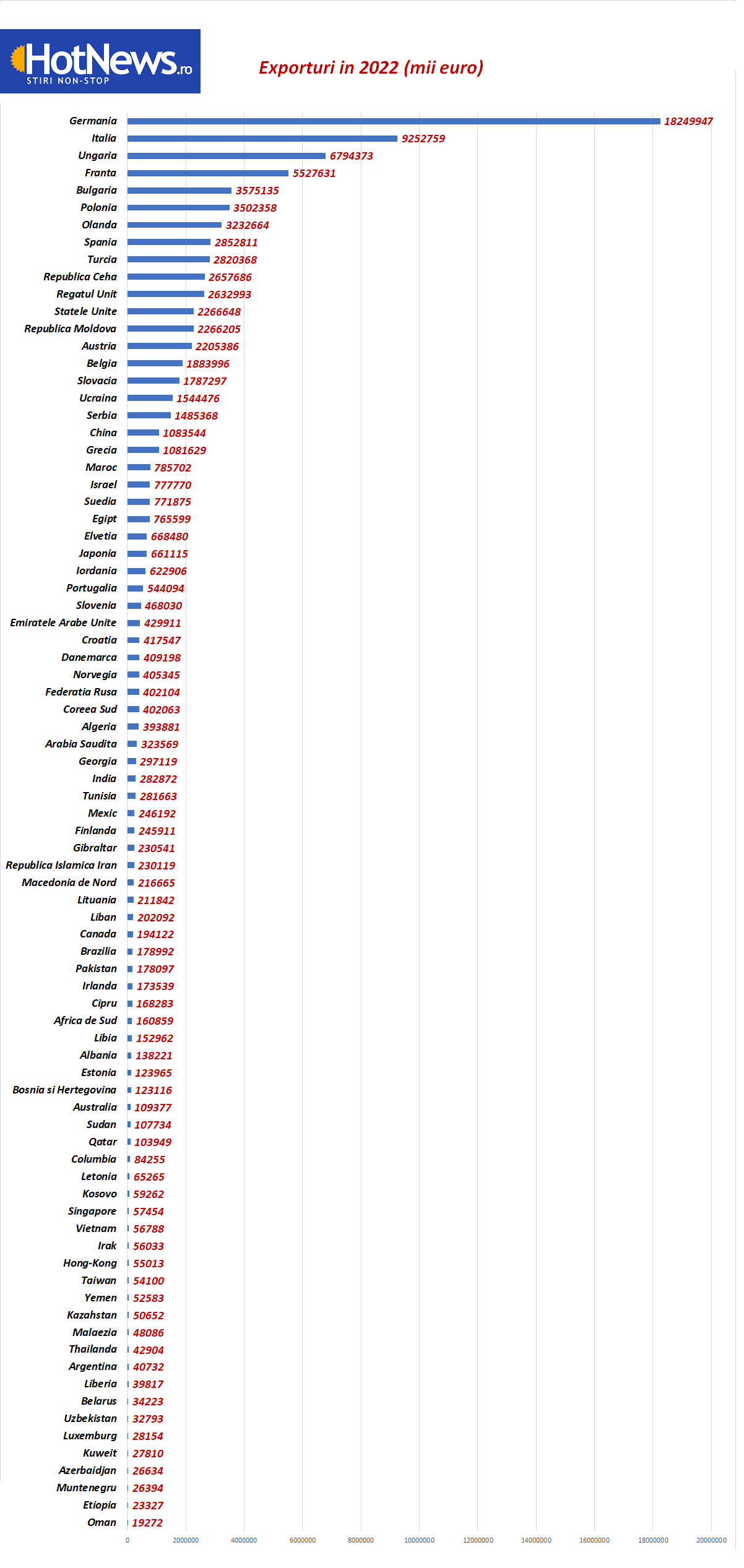 Dacă ne uităm la un an întreg (am luat anul 2022, pentru care există date), țările unde România are cele mai mari exporturi sunt cele de mai jos: