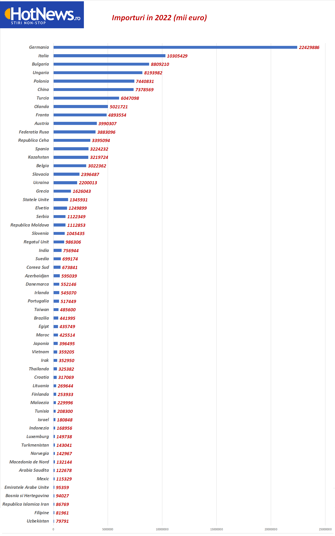 Țările în care România exportă cel mai mult sunt Germania, Italia și Ungaria, arată datele Statisticii pentru anul 2022. Importăm foarte mult din Ungaria și Bulgaria, iar cel mai mare deficit comercial îl avem cu China. Dacă ne uităm pe județe, Capitala ia o treime din importuri, fiind urmată de Ilfov, Timiș, Argeș și Prahova.