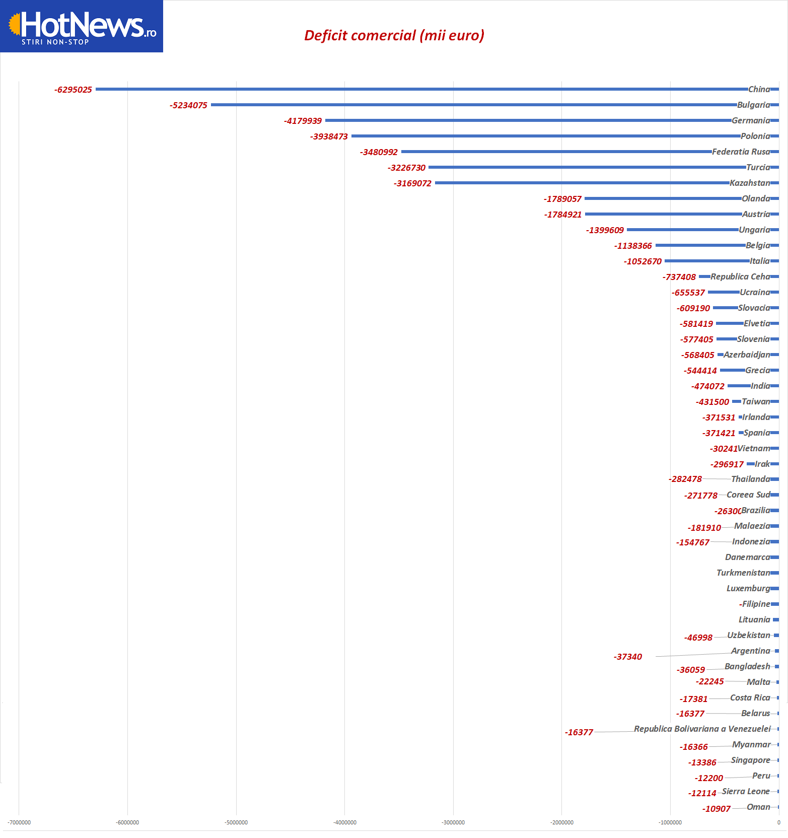 Deficitul comercial cel mai mare îl avem în relația cu chinezii, iar pe locul al doilea sunt vecinii bulgari.