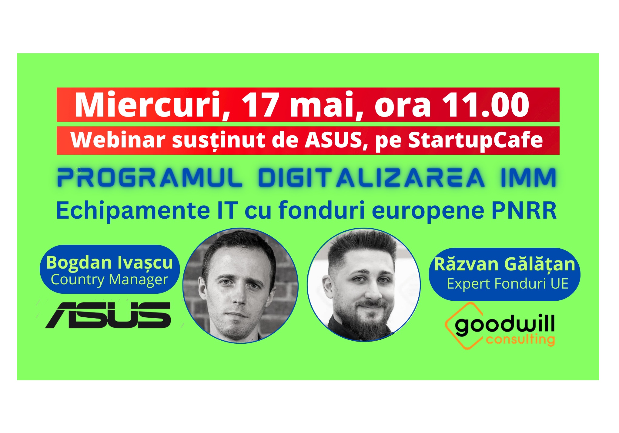 Miercuri, 17 mai, ora 11.00, antreprenorii români care vor să-și digitalizeze afacerile cu fondurile europene de câte 20.000-100.000 de euro prin Programul pentru Digitalizarea IMM au ocaiza să adreseze întrebări și să primească explicații privind schema de finanțare europeană, la un webinar live, video organizat de StartupCafe.ro, cu susținerea ASUS. Miercuri, 17 mai, ora 11.00, WEBINAR live pe StartupCafe: Programul pentru Digitalizarea IMM. Explicații despre finanțările PNRR de max. 100.000 EUR pentru antreprenori