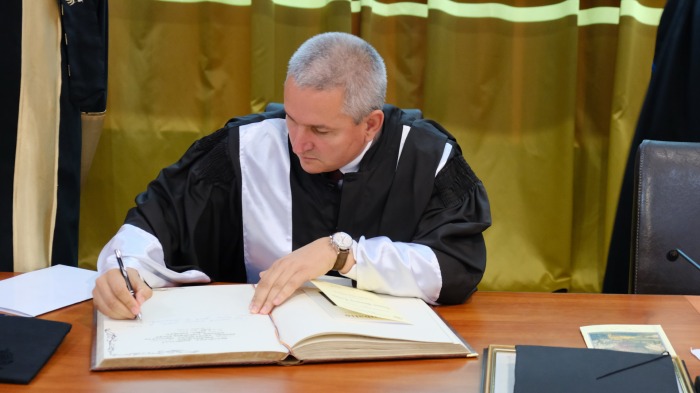 ,,Profesorul” Nicu Marcu, cel cu titlul obținut la desfiintata Universitatea Financiar-Bancară prin frauda de la Metalurgia nu roșește nici măcar o secundă atunci când i se citește ,,Laudatio’‘, prin care îi sunt prezentate fraudele academice drept ,,realizări”.